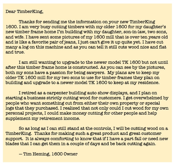 — Tim Heming, TimberKing 1600 Owner, Metamora MI