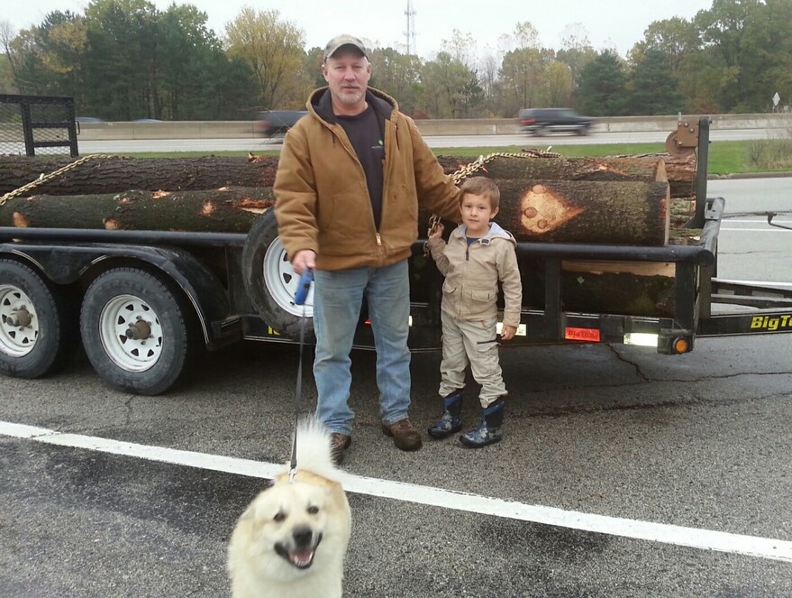Grandpa Tim hauled in 100 16′ white pine sawlogs with help from grandson, Connor, and faithful dog, Loki.