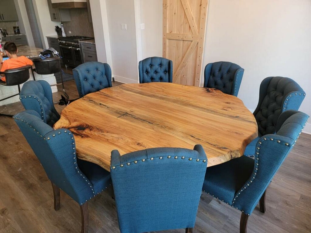 A couple from New Braunfels wanted a multi-piece, 80-inch diameter, irregular edge round table. They wanted a very deep blue epoxy. We made a custom base out of metal for this, and it is by far one of my most favorite projects I’ve ever worked on.
