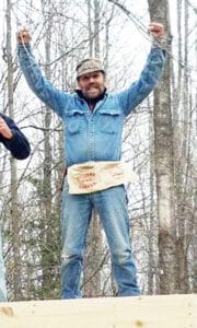 The camera caught Lynn exclaiming, “Yahoo! I got the first part of this tree stand done!”